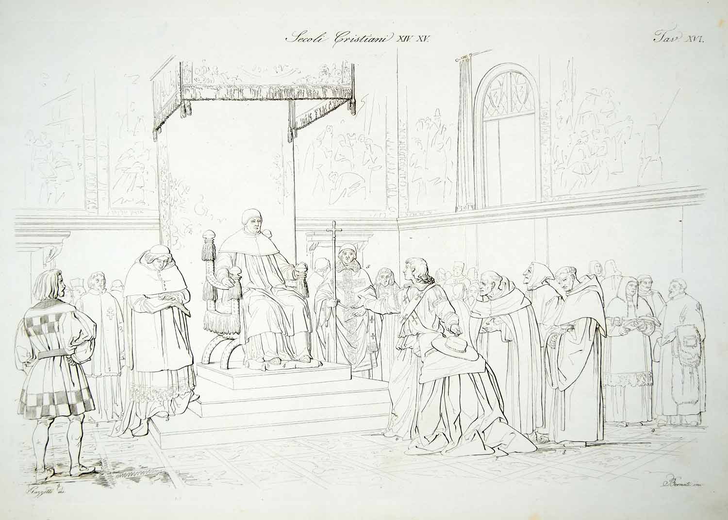 This is an original 1834 black and white copper engraving of the Pope seated on his throne with various members of the clergy before him, circa the 14th – 15th century.