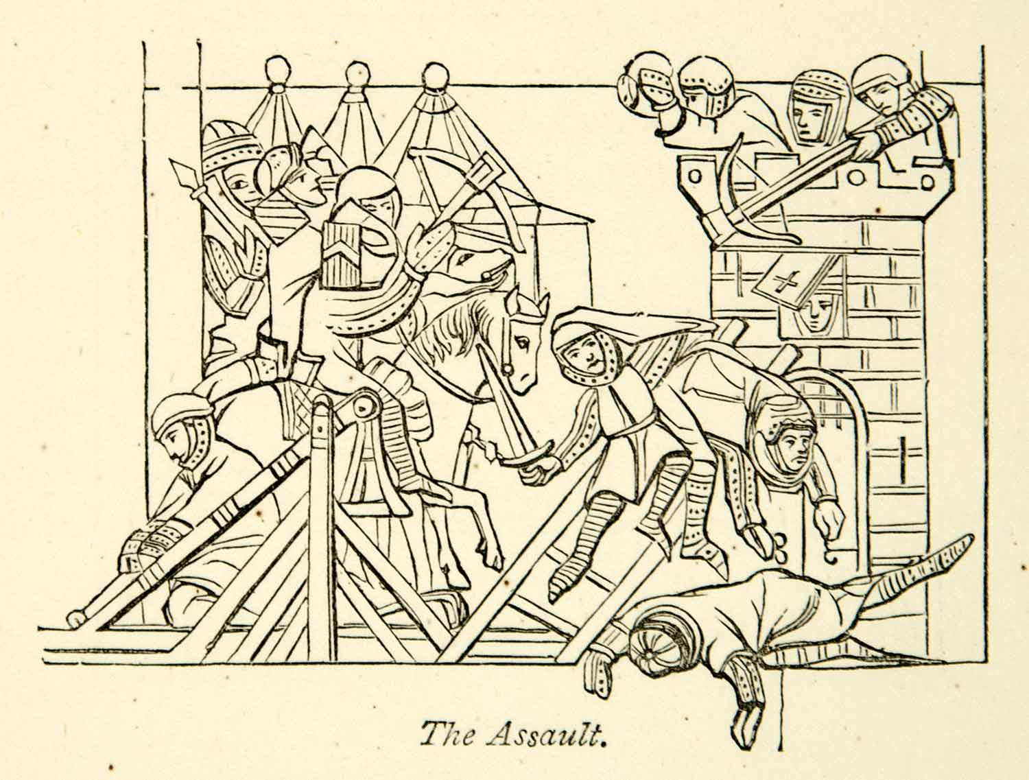 This is an original 1872 black and white in-text wood engraving of an assault upon castle walls during the Middle Ages. Sticks and stones may break my bones, and crossbow bolts will surely hurt me.