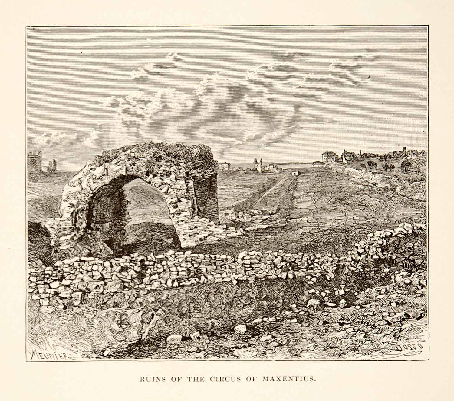 This is an original 1890 black and white in-text wood engraving of the ancient Roman ruins of the Circus of Maxentius which is located in Rome, Italy. It was built by order of Emperor Maxentius on the Via Appia (Appian Way) between 306 and 312 AD.