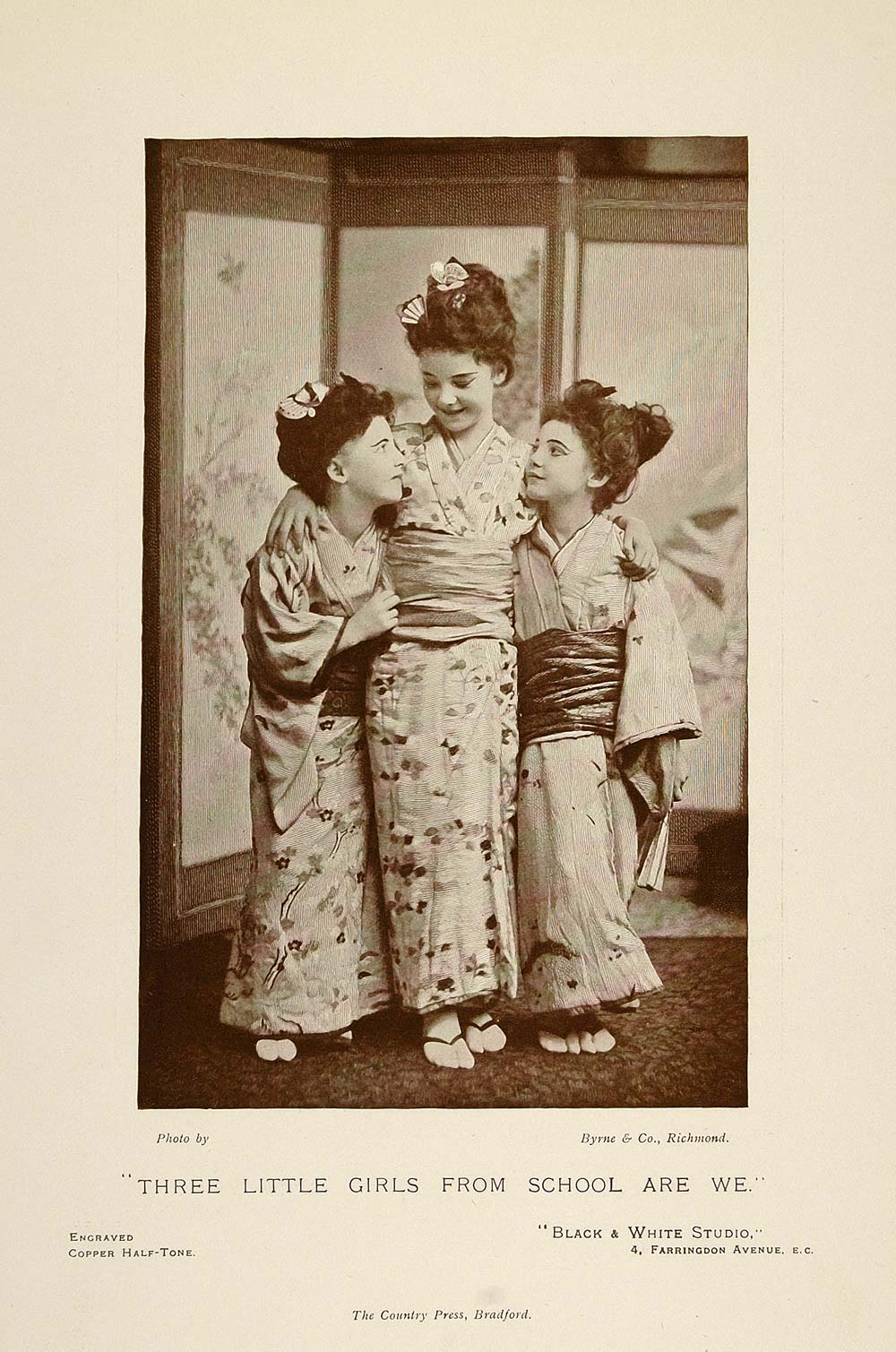 This is an original 1898 halftone print of three Japanese schoolgirls from a photograph by Byrne & Co., Richmond. Engraved copper halftone. “Black & White Studio.” (Please note that there is printing on the reverse.)