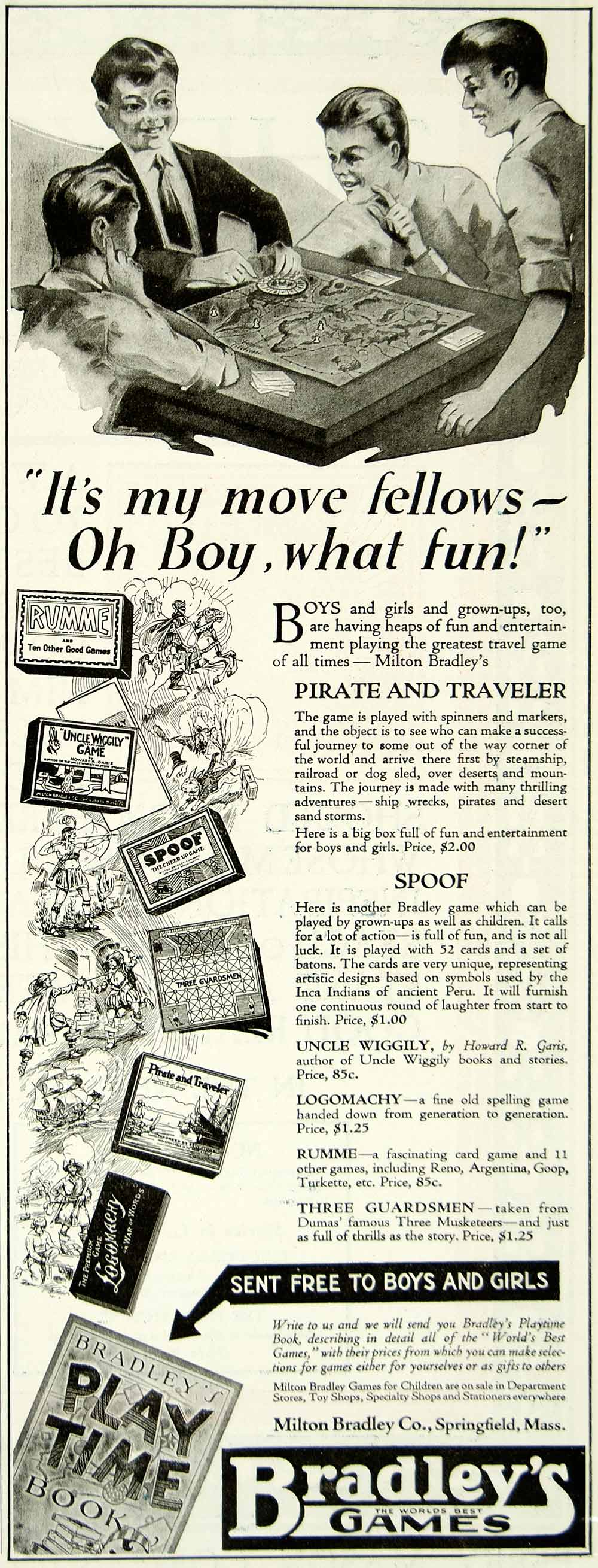 This is an original 1923 black and white print ad for the Pirate and Traveler, Spoof, Uncle Wiggily, Logomarchy, Rumme, and Three Guardsmen board games that were made and sold by the Milton Bradley Company of Springfield, Massachusetts (MA).