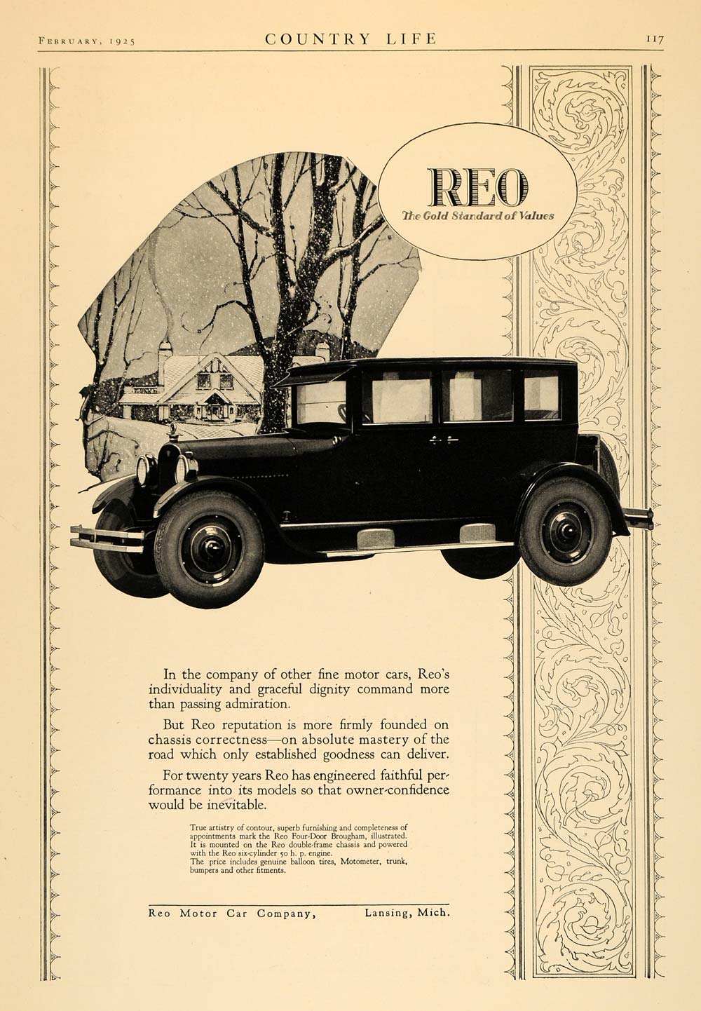 This is an original 1925 black and white print ad for Reo Motor Car Company, specially featuring a Four-Door Reo Brougham automobile.