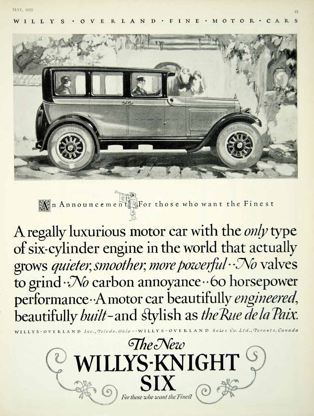 This is an original 1925 black and white print ad for the Willys-Knight Six automobile from Willys-Overland, Inc., Toledo, Ohio.