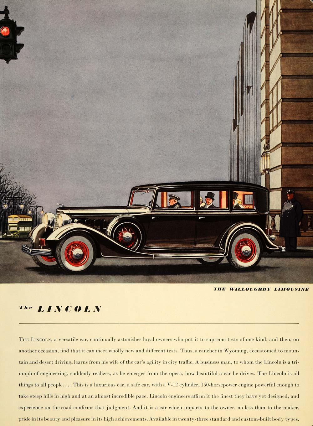 This is an original 1934 color print ad for Lincoln Luxury Cars, made by Ford Motor Company in Detroit, Michigan.