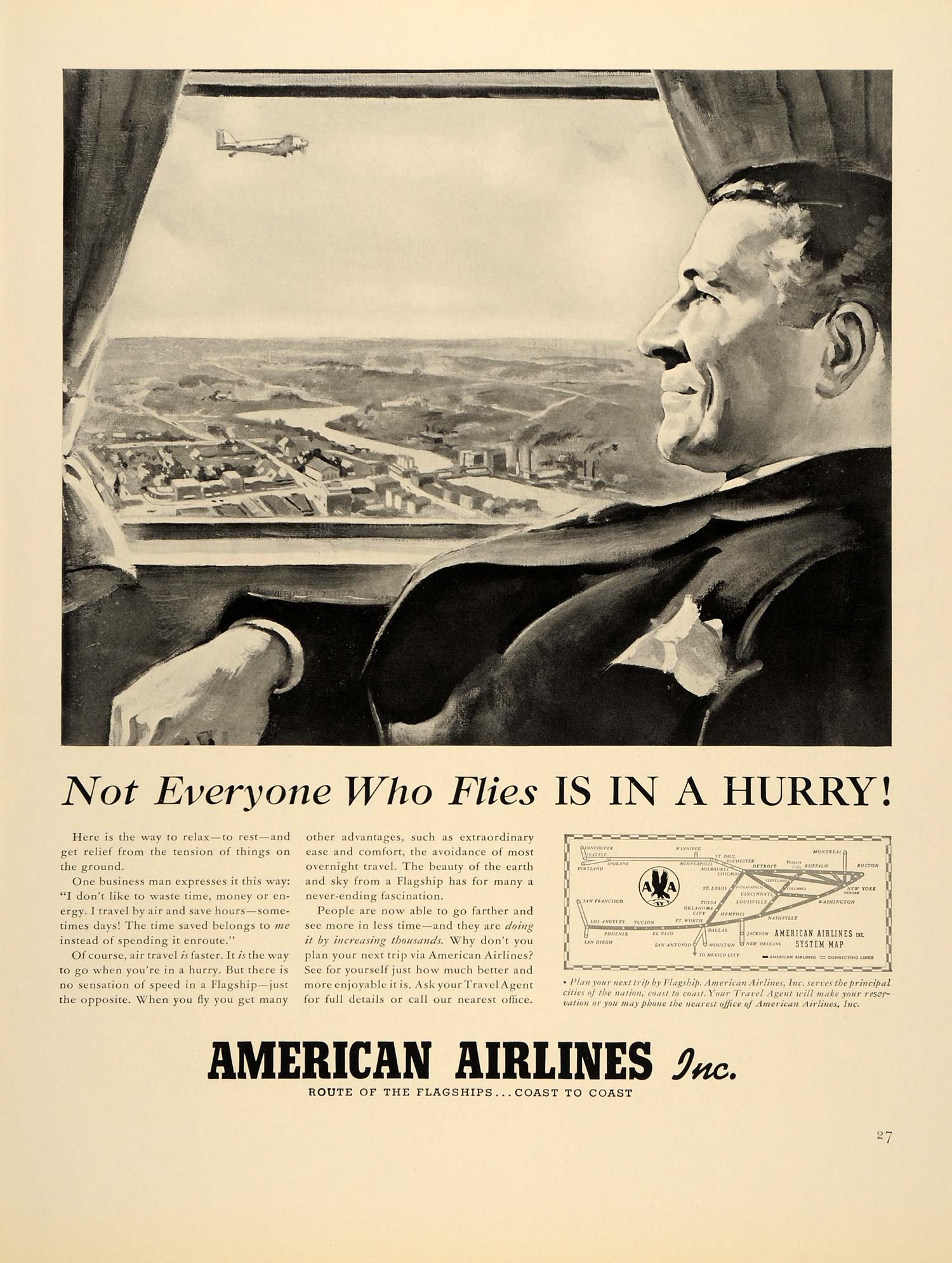 This is an original 1939 black and white print ad for American Airlines, Incorporated. Coast to coast and serving the principle cities of the nation. Relax in a Flagship!