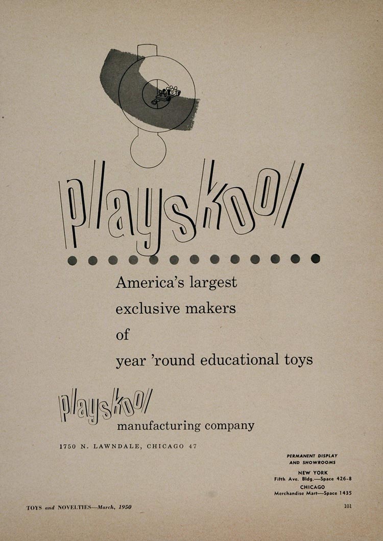 This is an original 1950 black and white print ad for Playskool Educational toys from the Playskool Manufacturing Company.