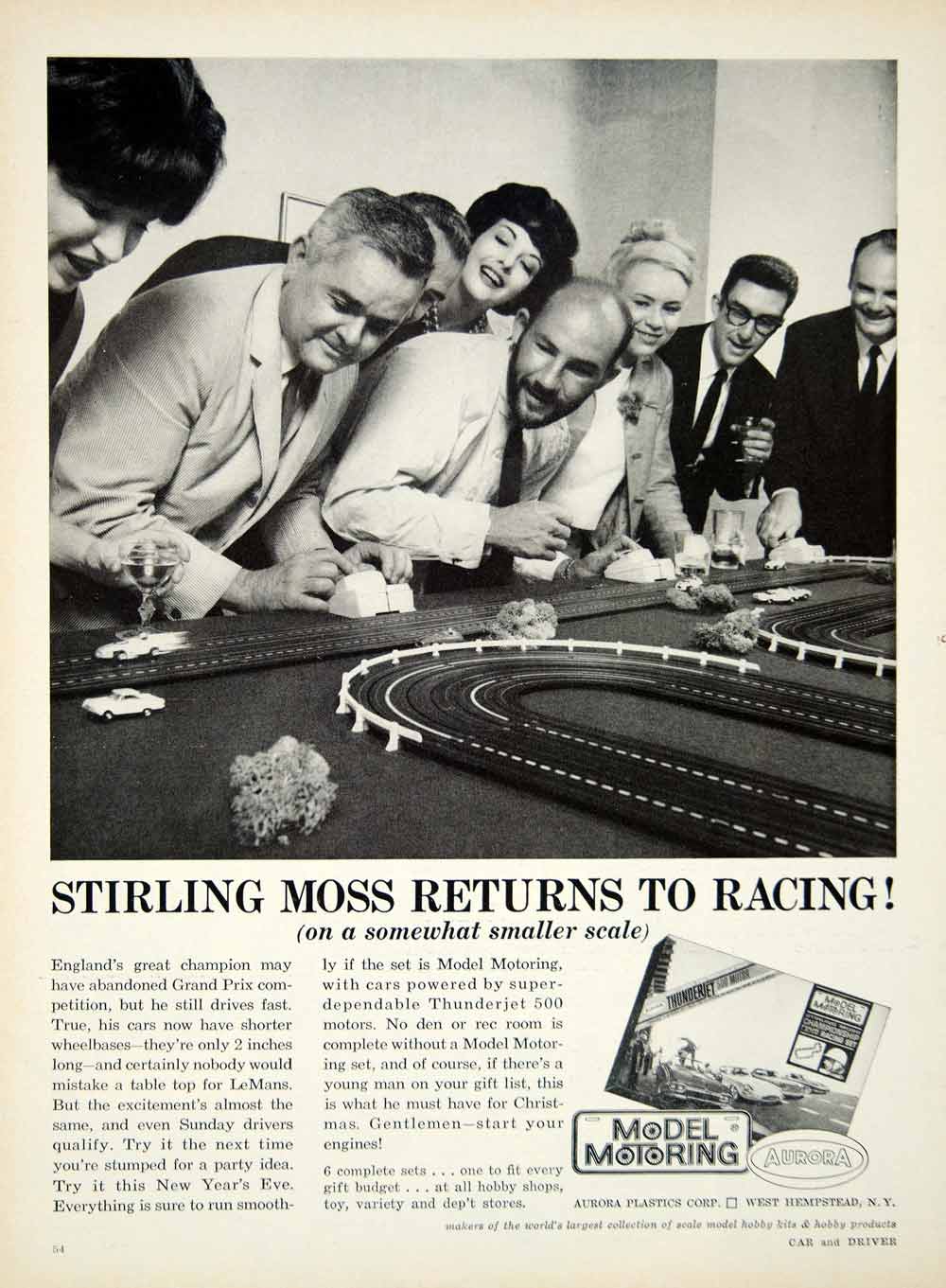 This is an original 1963 black and white print ad for the Thunderjet 500 model motoring race car set that was made and sold by Aurora Plastics Corporation and that was endorsed by former Formula 1 race car driver, Sir Stirling Moss.