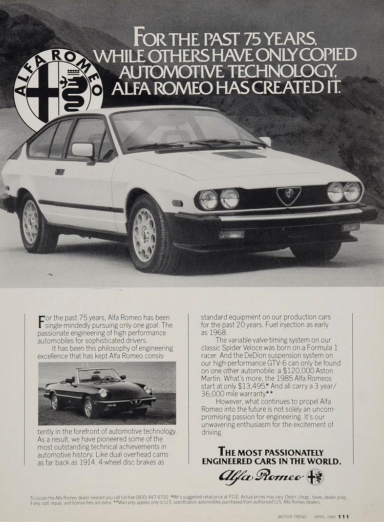 This is an original 1985 ad for Alfa Romeo technological automotive advances including dual overhead cams, 4-wheel disc brakes, fuel injection, the variable valve timing system, and the DeDion suspension system.