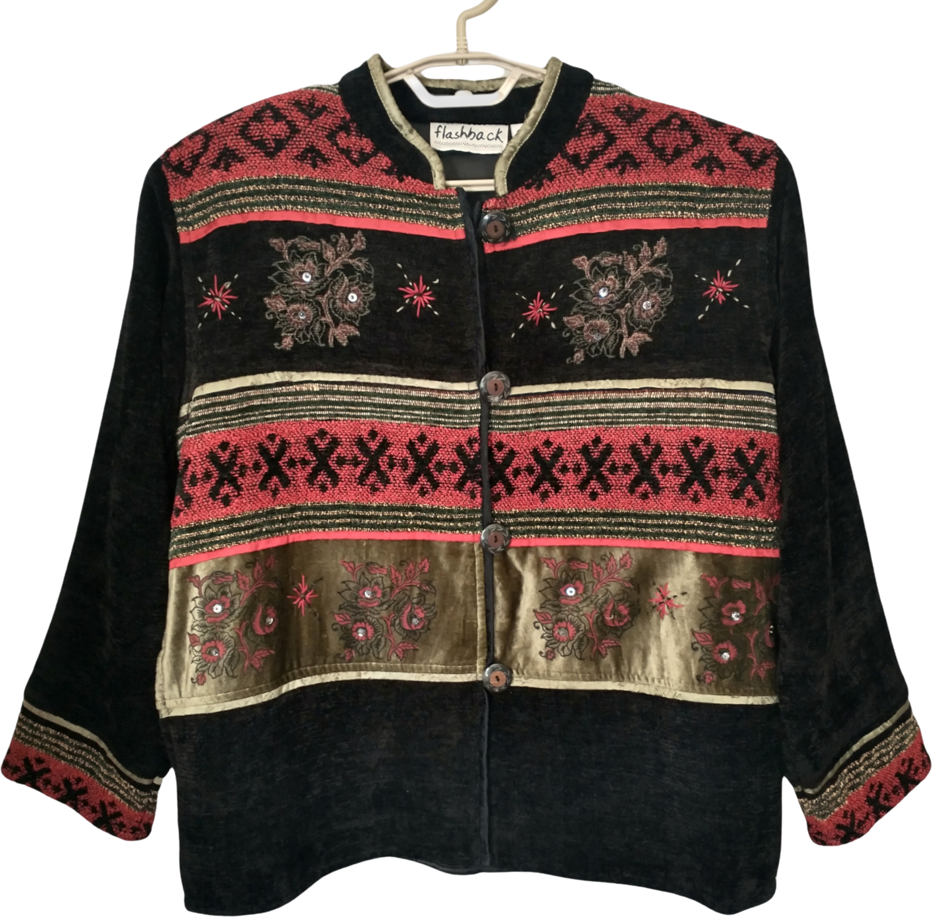 Vtg Flashback Jacket Shacket Embroidered Tapestry Chenille Mixed Media Condition is pre-owned and vintage 1990s. No rips, tears, holes or discolorations. Super cool art to wear boho jacket. Fully Lined with a satin material. 2 front pockets. Oversized and relaxed fit.Measures:Chest: 44″Shoulder to shoulder: 18″Length: 26″