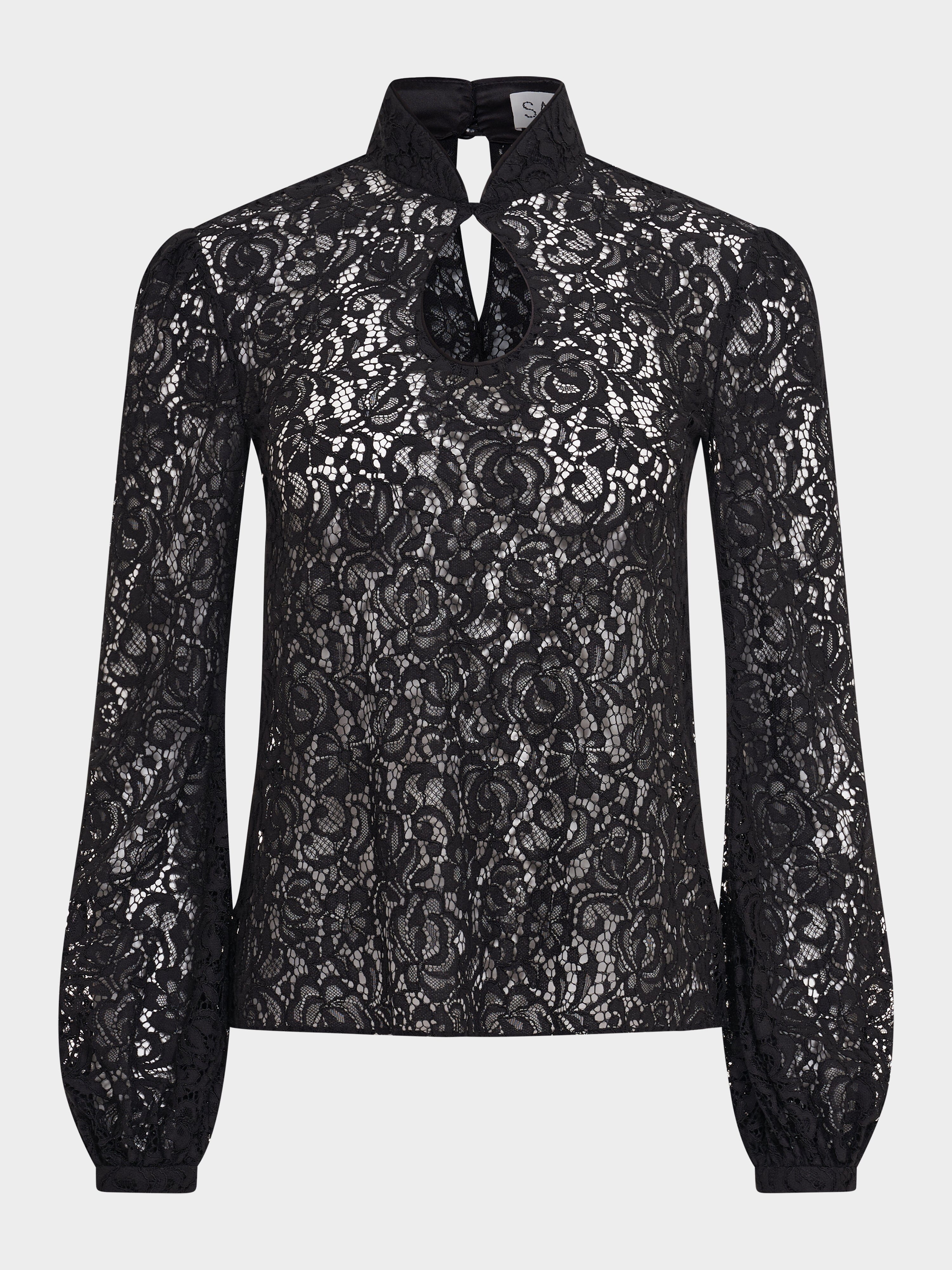 The Domino Top in Black is crafted from elegant Guipure lace, showcasing a delicate floral pattern that exudes timeless sophistication. This long-sleeved top features a high neck and a graceful keyhole neckline, while the sleeves are gathered at the cuffs, offering a subtle yet stylish detail that enhances the overall femininity of the piece. Perfect for elevating any look.