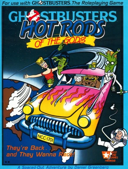 Hot Rods of the Gods is a 48-page mondo blowout GHOSTBUSTERS adventure. Chock full of fun illustrations and pullouts, Hot Rods features an 11″ by 17″ card-stock map of Manhattan, The Mostly All New & Improved Super-Mega Ectomobile, and full-color hot rod counters for running the climactic demolition derby! A gas for 2-6 players, ages 12 and up.