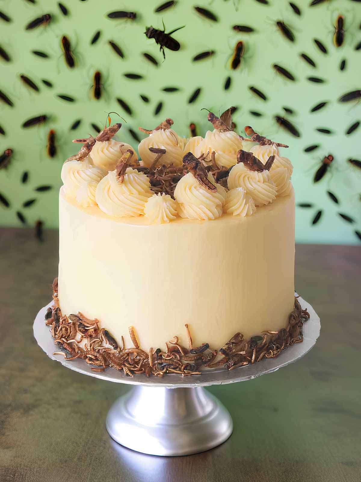 Decoration: Buttercream swirls with a mix of roasted edible insects including crickets, mealworms and locusts.