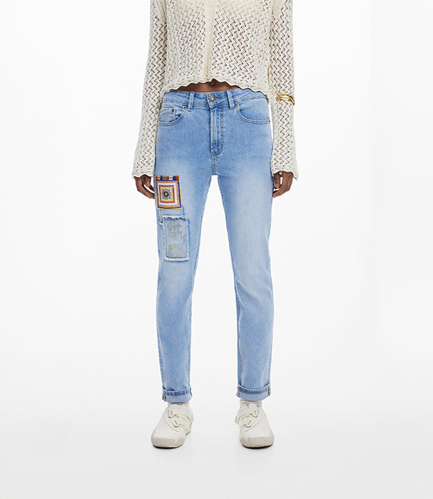 דזיגואל ג’ינס לנשים, בצבע כחול בהיר משופשף, בשילוב פאצ’ים עם רקמה, עם כיסים קדמיים ואחוריים, בסגירת כפתור ורוכסן.