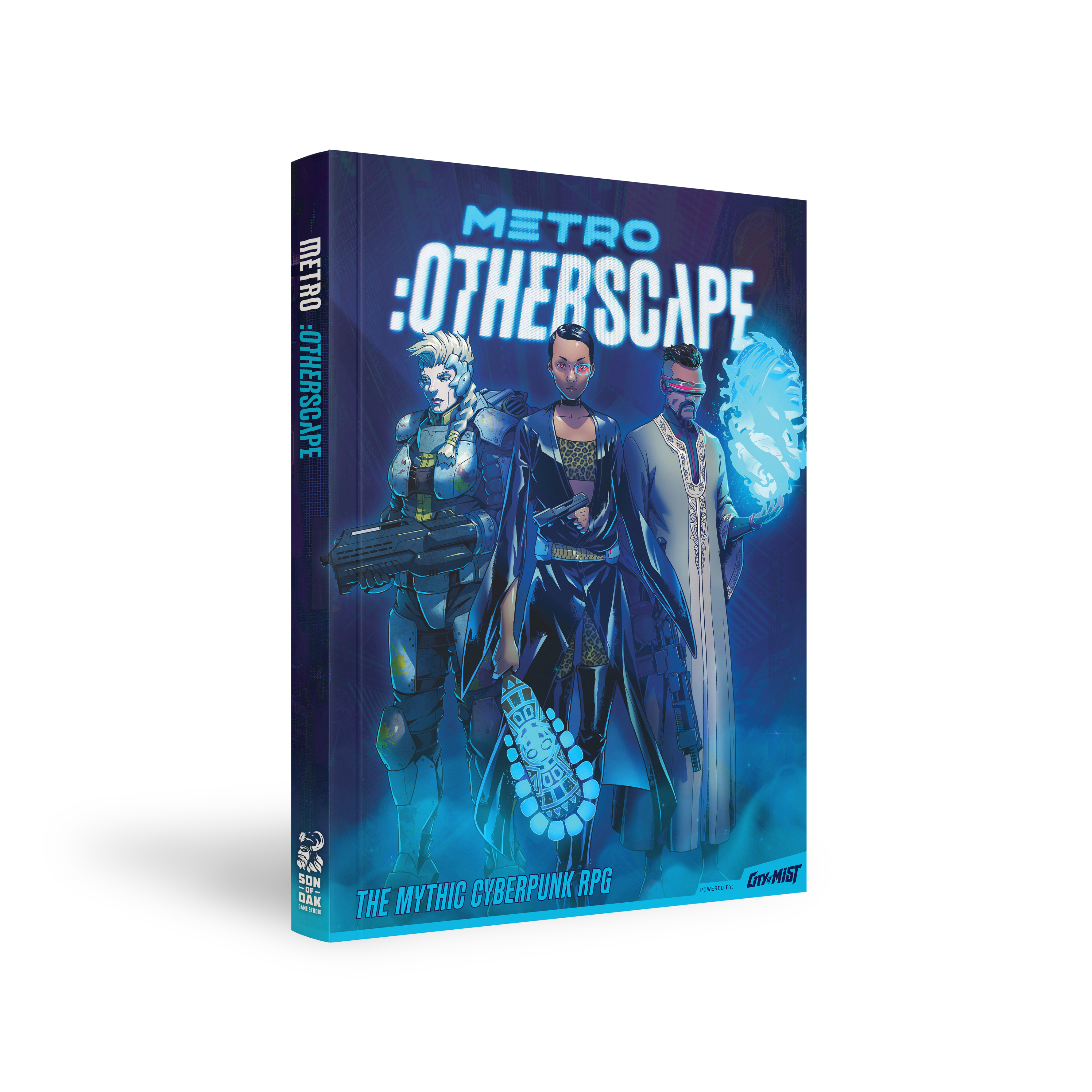 :Otherscape is a fantasy-cyberpunk role-playing game that combines supernatural powers inspired by mythology and legend with the gritty neon-lit streets of a sprawling futuristic Megacity. It takes your game group on a rollercoaster ride of gunfights, vehicle chases, cyberspace heists, urban wasteland exploration, clashes of mythology and technology, faction wars, and philosophical questions about the nature of being human — and how to transcend it.