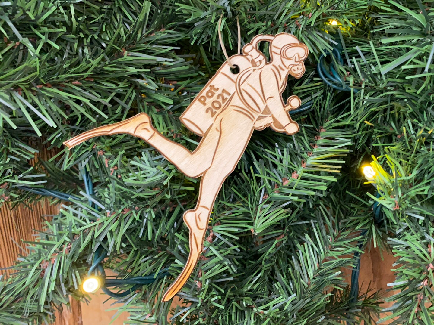 Made of beautiful and sturdy Baltic birch, this ornament is perfect for the SCUBA naver in your life. We create our ornaments to order with any name laser engraved in the design.