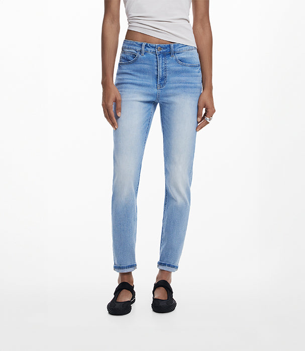 דזיגואל ג’ינס לנשים, בצבע כחול בהיר משופשף, עם כיסים קדמיים ואחוריים, בסגירת כפתור ורוכסן.