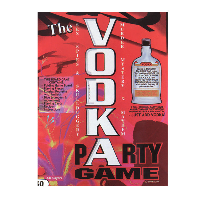 The Vodka Party Game. Contains Folding Game Board, Playing Pieces, Russian Roulette with Bullets, Dice, Playing Cards, Recipes and Instructions.