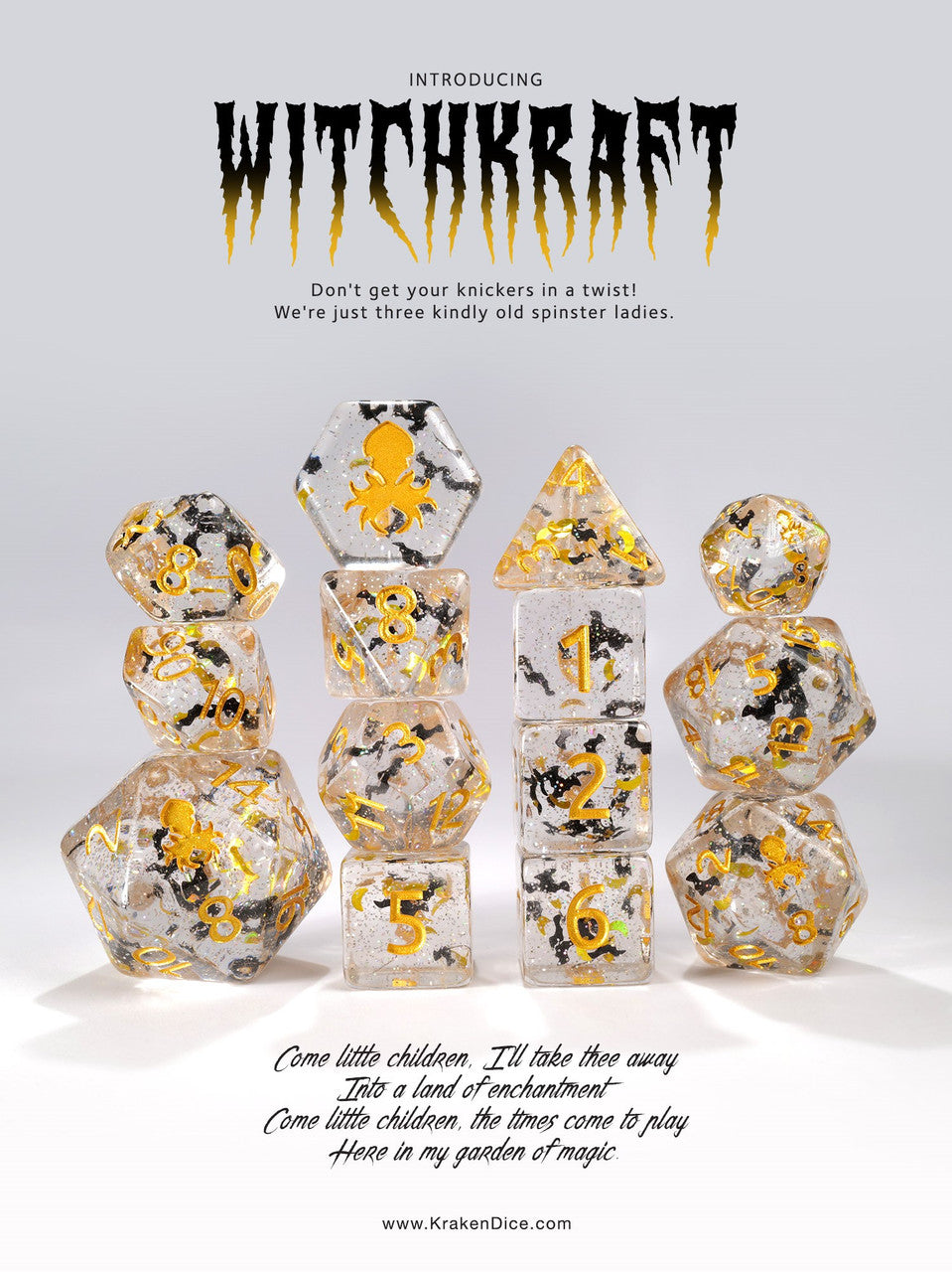 With Bat and Moon inclusions, Kraken Dice is proud to present our newest dice set: WitchKraft. This limited edition 14pc dice set is the perfect addition to your Halloween themed games, or for those who celebrate the spooky all year round!