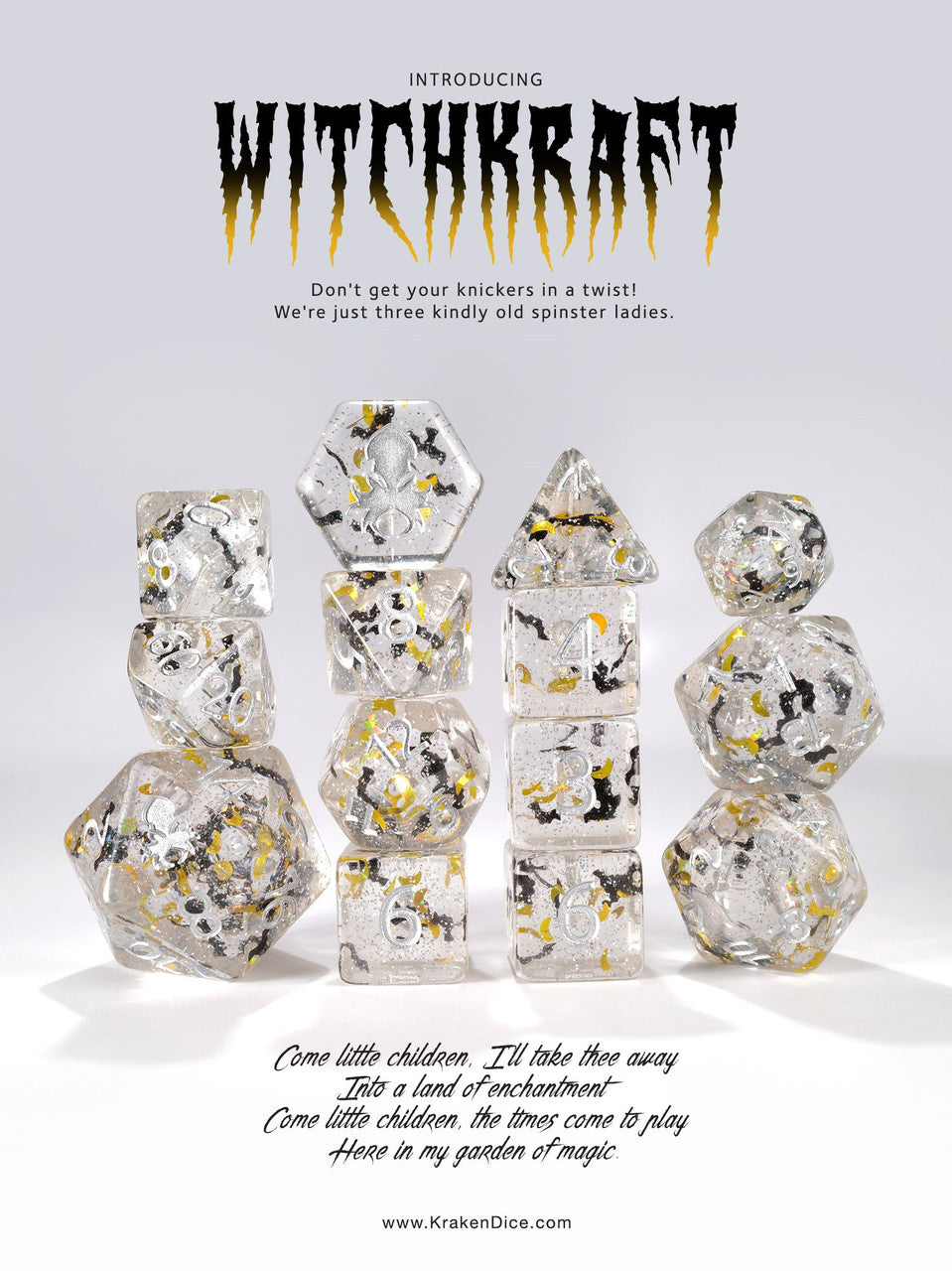 With Bat and Moon inclusions, Kraken Dice is proud to present our newest dice set: WitchKraft. This limited edition 14pc dice set is the perfect addition to your Halloween themed games, or for those who celebrate the spooky all year round!