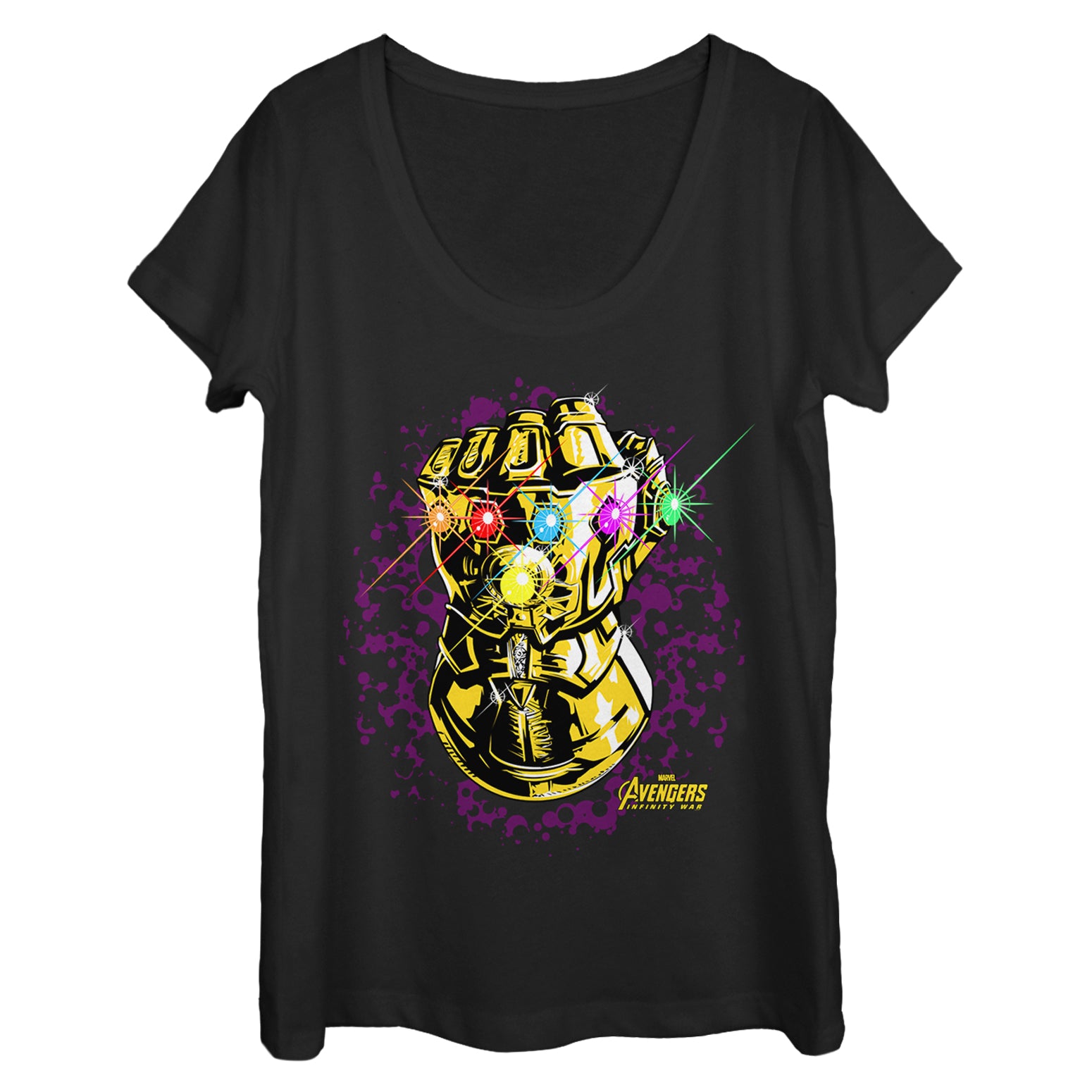 The world needs all the help it can get going up against the Infinity Gauntlet and the Marvel Avengers: Infinity War Gauntlet Sparkle Women’s Scoop Neck T-Shirt! Thanos’ gauntlet glove shows off the six sparkling infinity stones on this Avengers: Infinity War shirt.