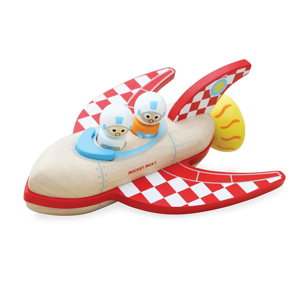 Blast off with this amazing wooden toy rocket with movable rocket flames. Complete with two colorful removable wooden spacemen.